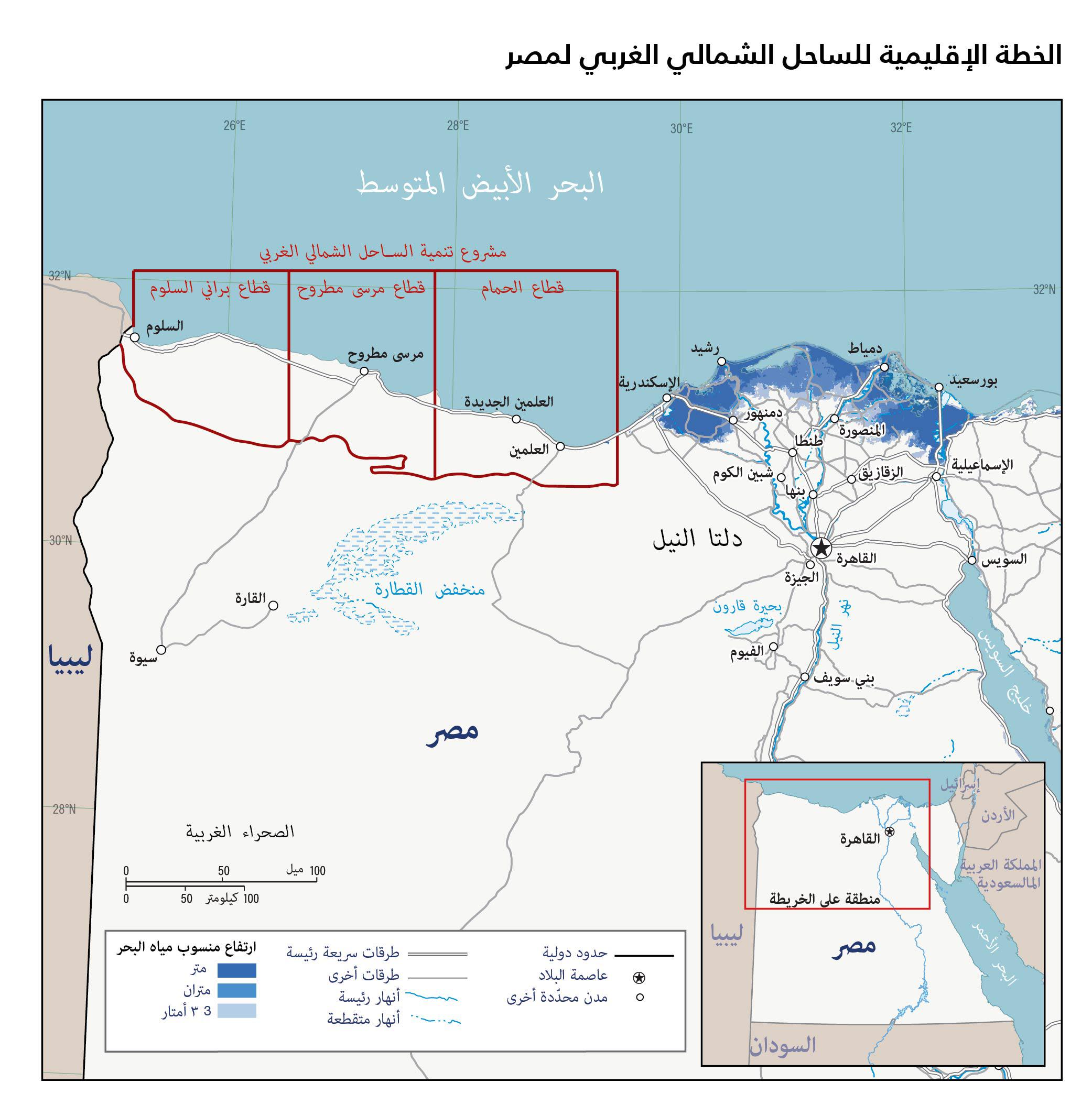 بحلول العام 2050، قد يتعرض أكثر من 10 ملايين شخص على الساحل الشمالي الغربي لمصر للنزوح بسبب التداعيات الناجمة عن تغير المناخ، وفقًا لبرنامج الأمم المتحدة الإنمائي. تدرك الحكومة المصرية المخاطر المُحدقة بالساحل الشمالي الغربي، لكنها لا تزال مستمرة في خططها الرامية إلى توطين 5 ملايين شخص في المنطقة بحلول العام 2052، في إطار جهودها الحثيثة لاستيعاب زيادة سكانية تُقدَّر بنحو 34 مليون نسمة على مستوى البلاد. ولتحقيق ذلك، أطلقت مصر سلسلةً من المشاريع الإنمائية وأجرت مراجعة شاملة لخططها الحضرية والطبوغرافية والإدارية الخاصة بالساحل.