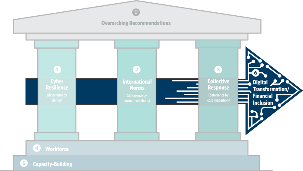 To achieve more effective protection of the global financial system against cyber threats, this report, “International Strategy to Better Protect the Global Financial System Against Cyber Threats,” outlines thirty-two recommendations and forty-four supporting actions to be implemented ideally in the 2021–2024 timeframe. Figure 2 and Table 1 illustrate how the recommendations and supporting actions are organized into strategic priority areas with three core pillars and three complementary crosscutting issues: