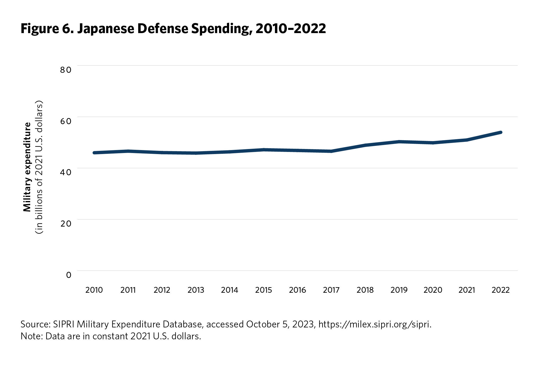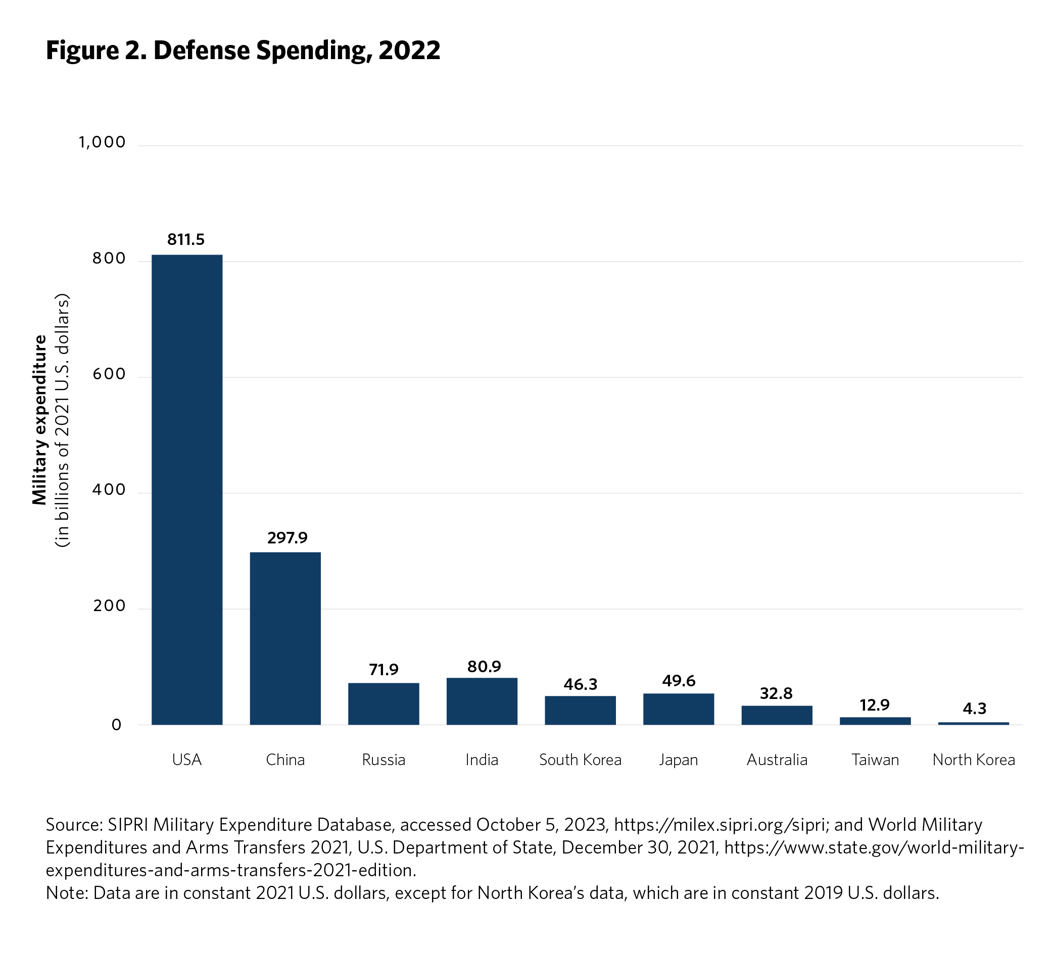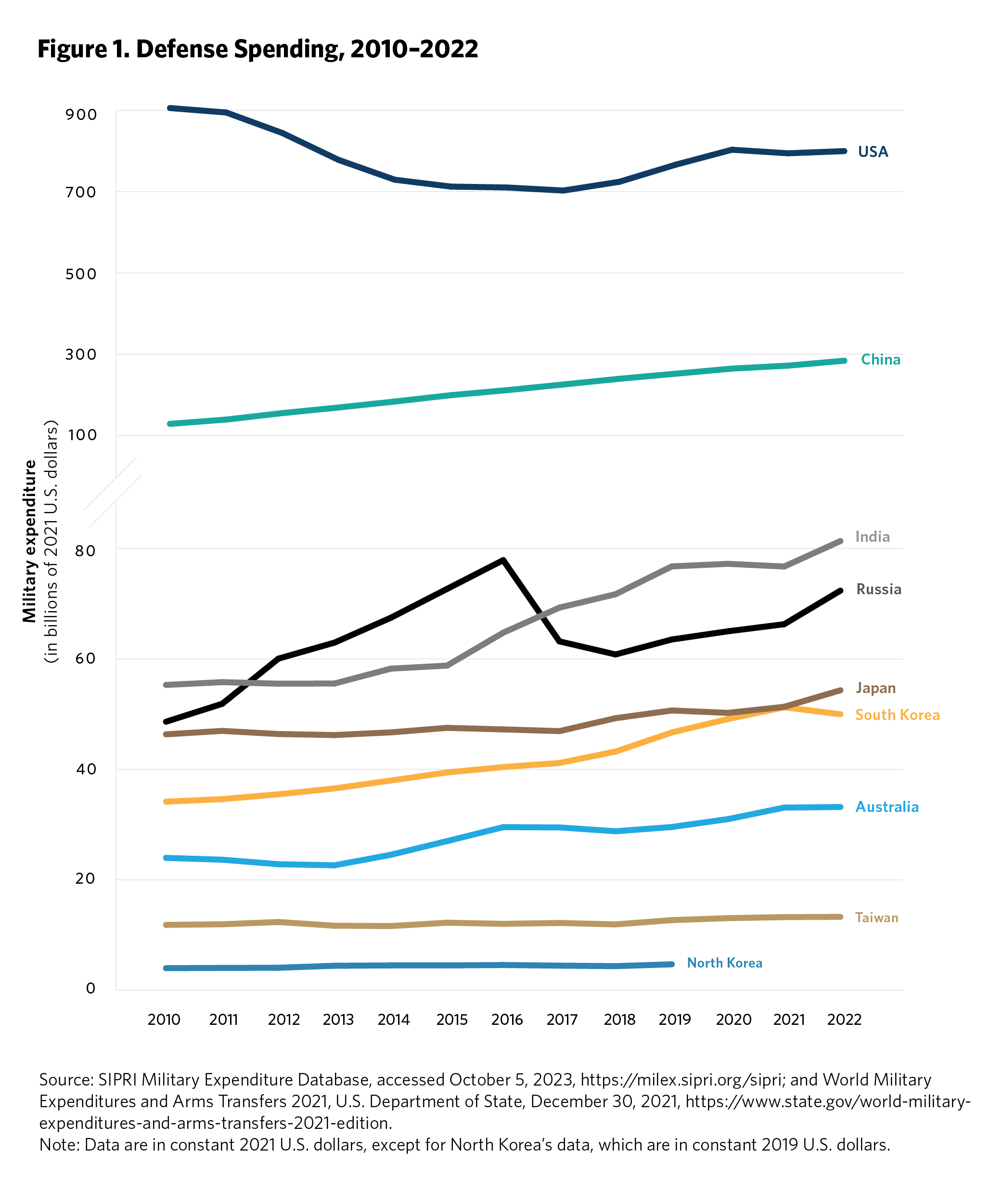 5 Ken Moriyasu, “‘Geopolitical Powder Keg’ Asia Jacks Up Global Military Spending,” Nikkei Asia, August 25, 2022, https://asia.nikkei.com/Politics/International-relations/Indo-Pacific/Geopolitical-powder-keg-Asia-jacks-up-global-military-spending . Time series data on regional defense spending is available from the SIPRI Military Expenditure Database, Stockholm International Peace Research Institute, accessed September 2023, https://www.sipri.org/databases/milex.