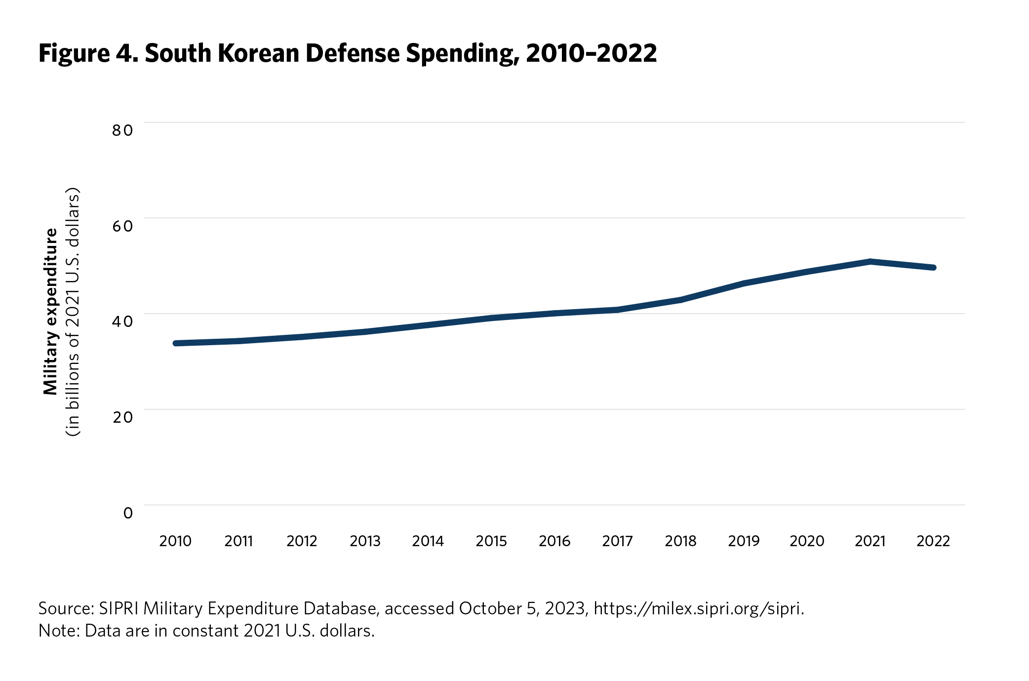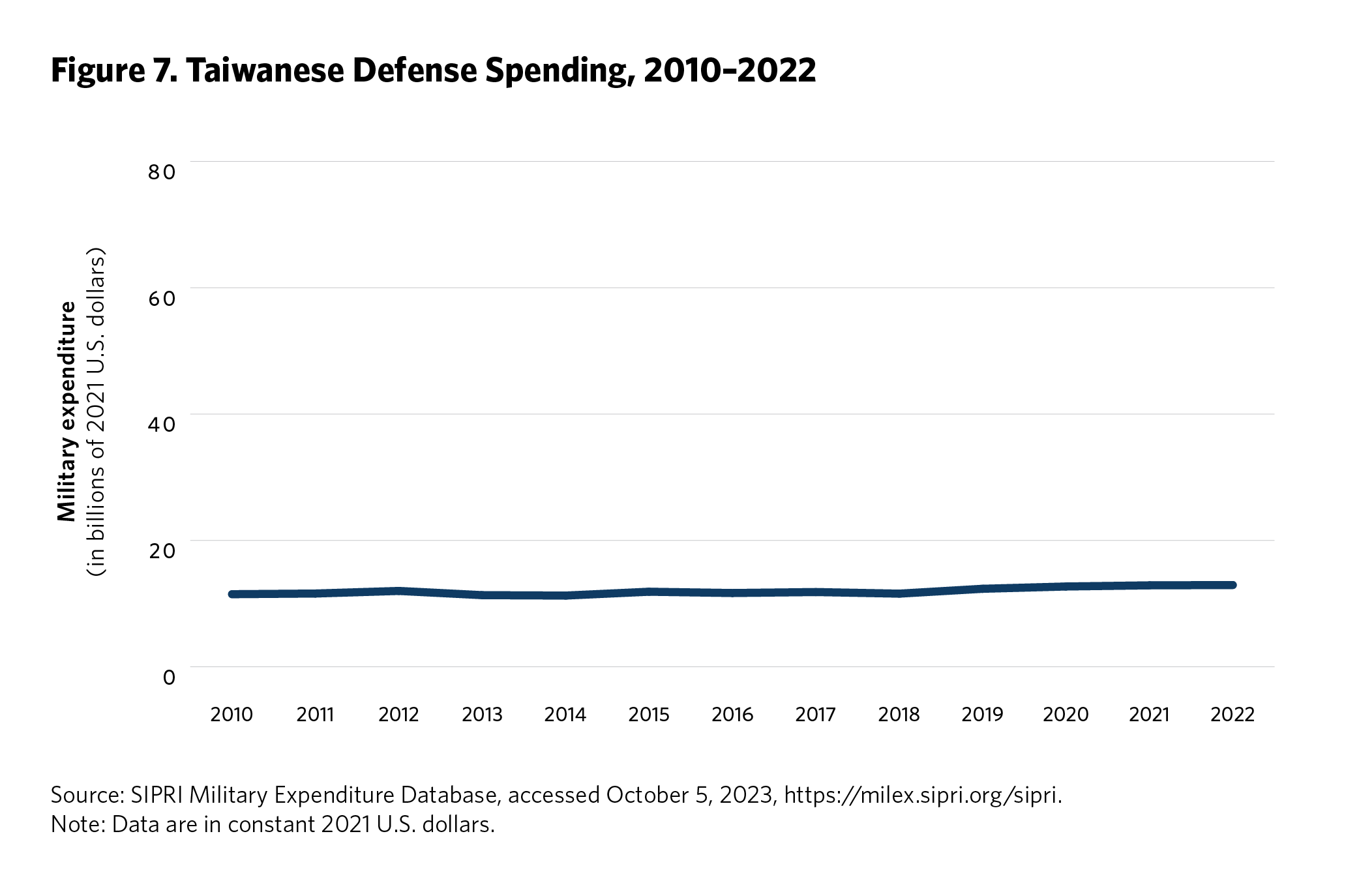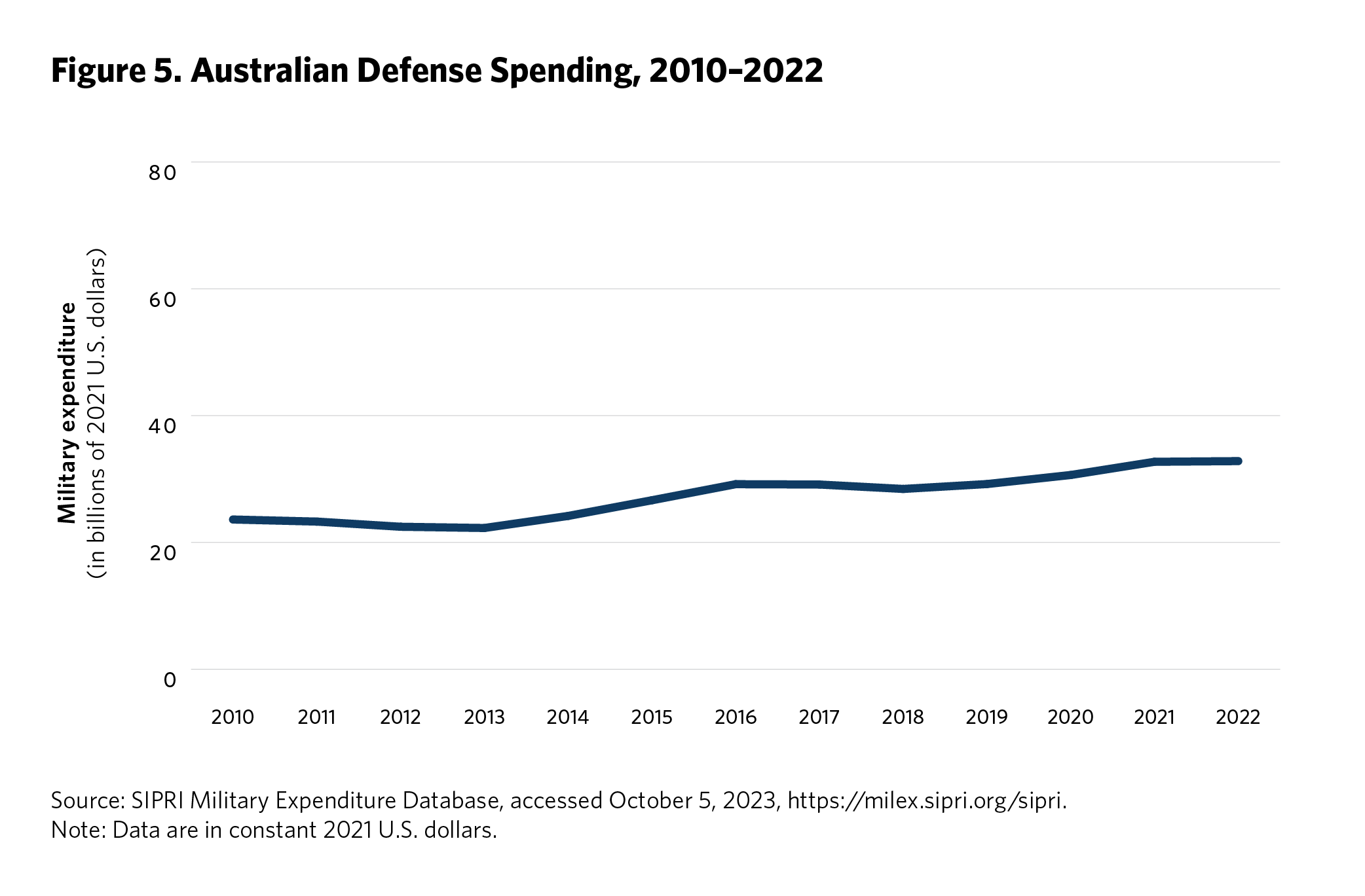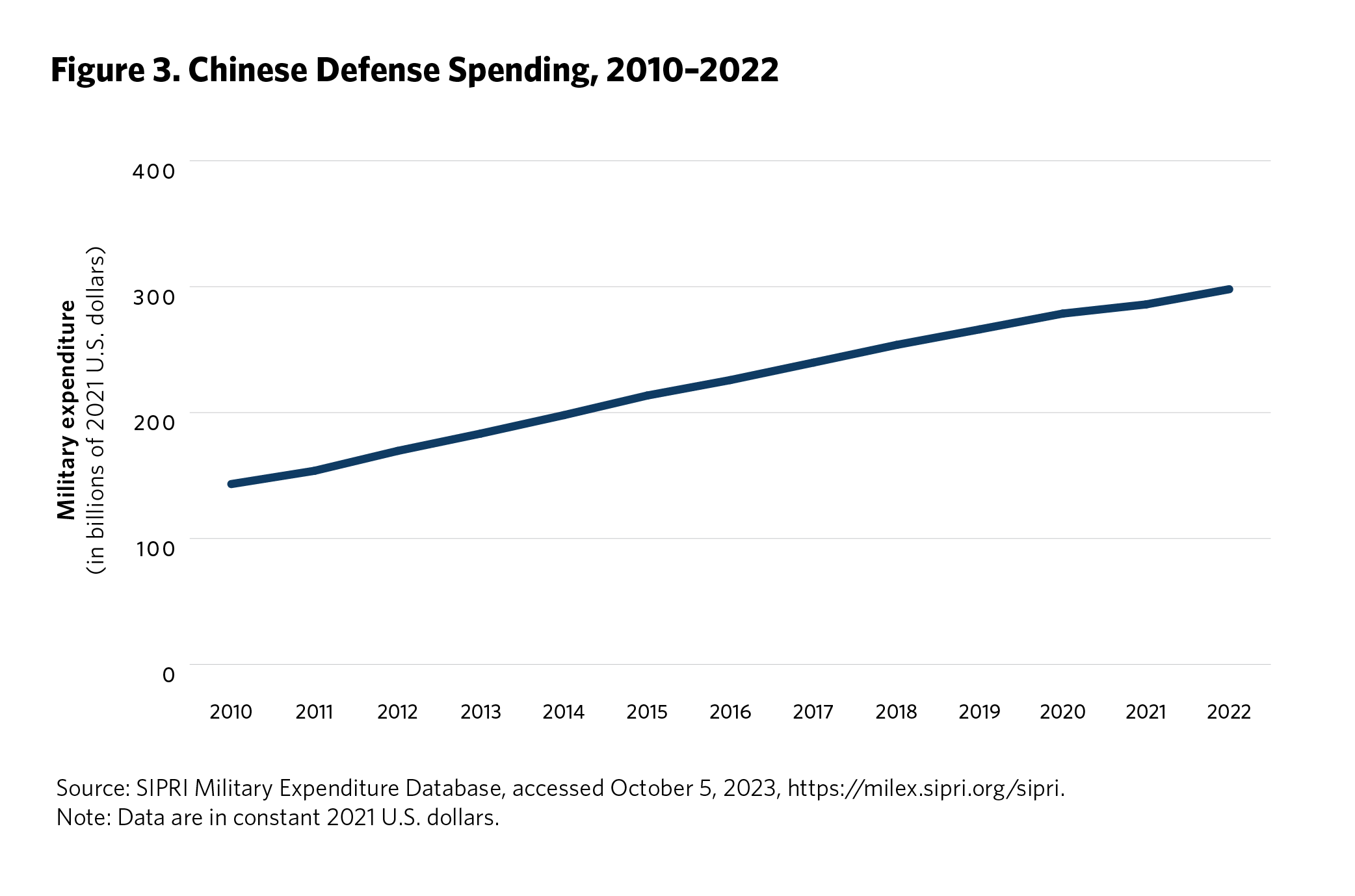 5 Ken Moriyasu, “‘Geopolitical Powder Keg’ Asia Jacks Up Global Military Spending,” Nikkei Asia, August 25, 2022, https://asia.nikkei.com/Politics/International-relations/Indo-Pacific/Geopolitical-powder-keg-Asia-jacks-up-global-military-spending . Time series data on regional defense spending is available from the SIPRI Military Expenditure Database, Stockholm International Peace Research Institute, accessed September 2023, https://www.sipri.org/databases/milex.